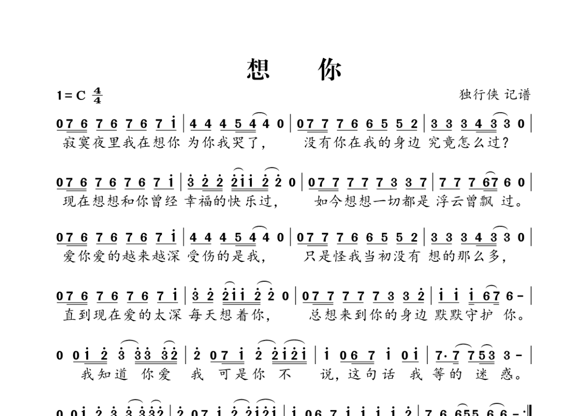 《想你》,拍号为4/4拍,这份简谱共有一张高清图谱,图谱由 @独行侠 编配上传。