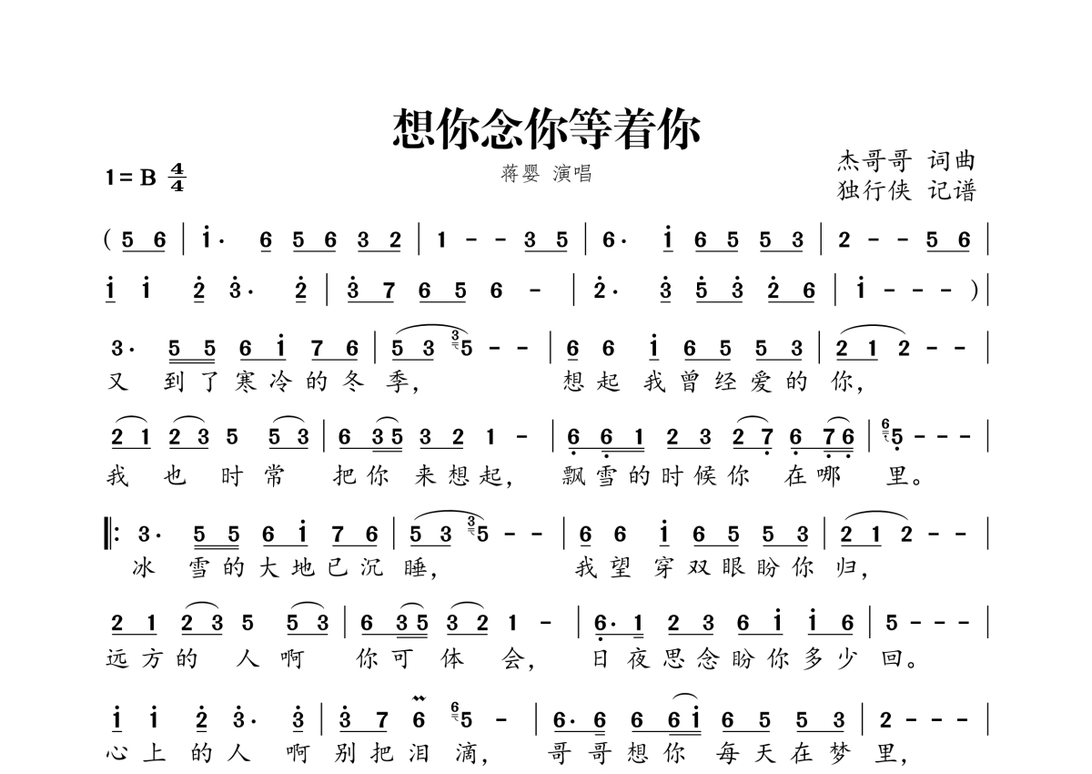 《想你念你等着你》是蒋婴演唱的一首歌曲,拍号为4/4拍,这份简谱共有一张高清图谱,图谱由 @独行侠 编配上传。