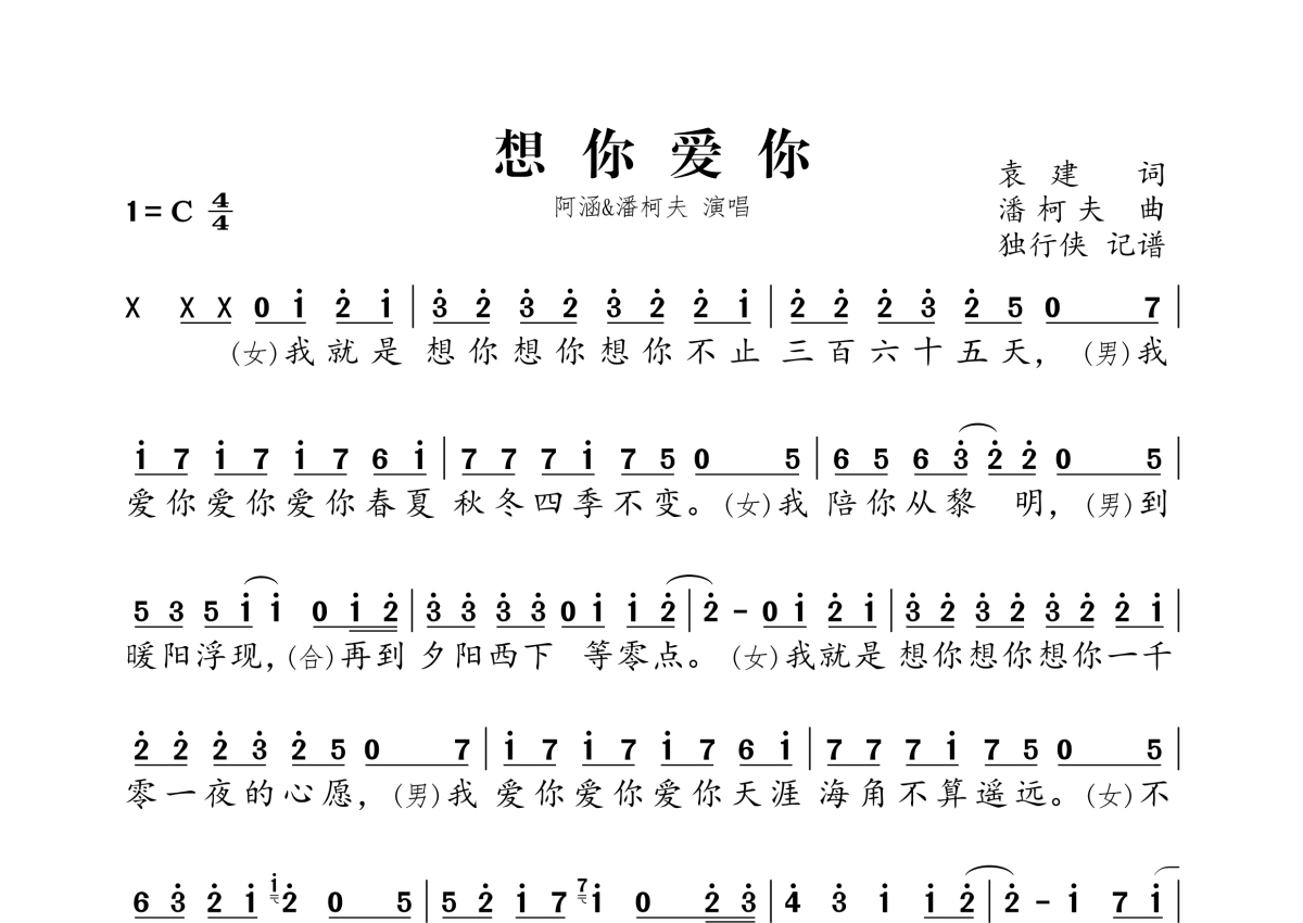《想你爱你》是阿涵&潘柯夫演唱的一首歌曲,拍号为4/4拍,这份简谱共有两张高清图谱,图谱由 @独行侠 编配上传。