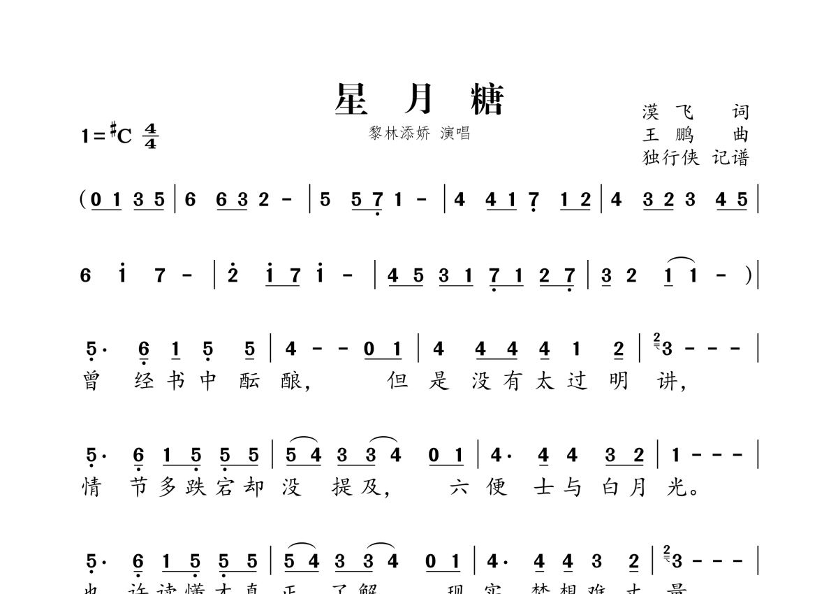 《星月糖》是黎林添娇演唱的一首歌曲,拍号为4/4拍,这份简谱共有两张高清图谱,图谱由 @独行侠 编配上传。