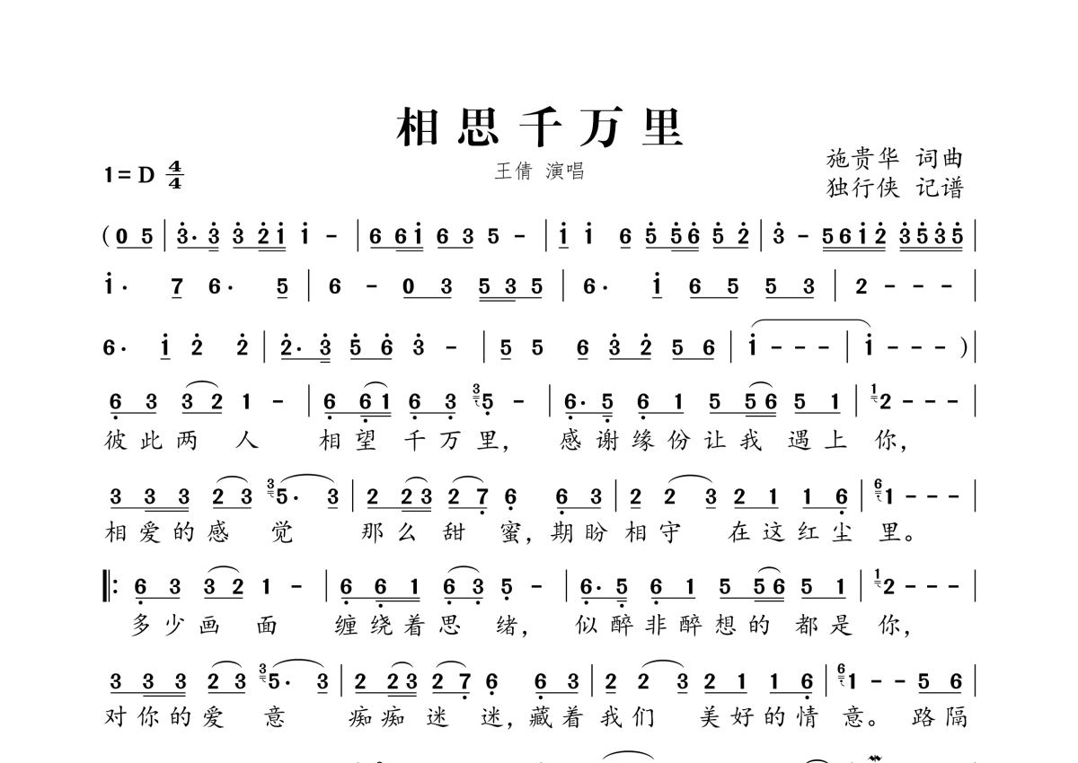 《相思千万里》是王倩演唱的一首歌曲,拍号为4/4拍,这份简谱共有一张高清图谱,图谱由 @独行侠 编配上传。
