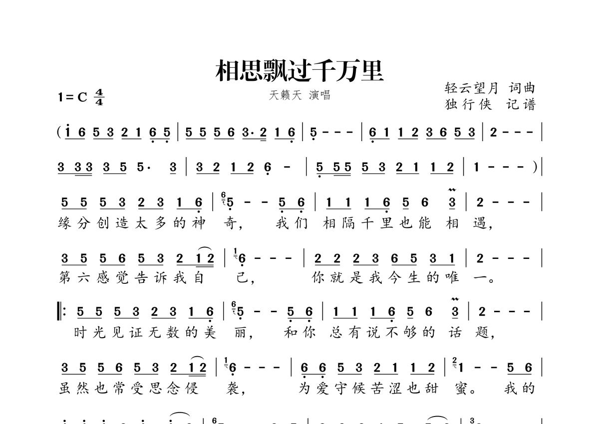 《相思飘过千万里》是天籁天演唱的一首歌曲,拍号为4/4拍,这份简谱共有一张高清图谱,图谱由 @独行侠 编配上传。