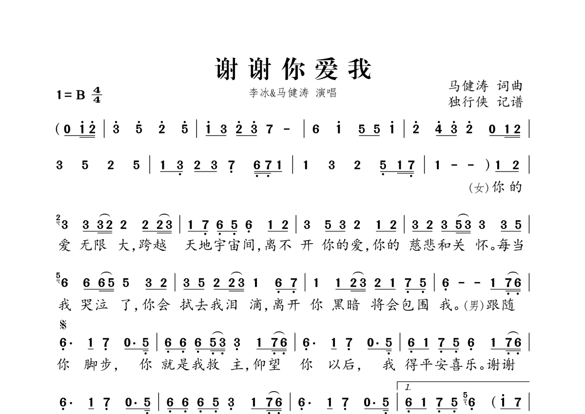 《谢谢你爱我》是李冰、马建涛演唱的一首歌曲,拍号为4/4拍,这份简谱共有一张高清图谱,图谱由 @独行侠 编配上传。
