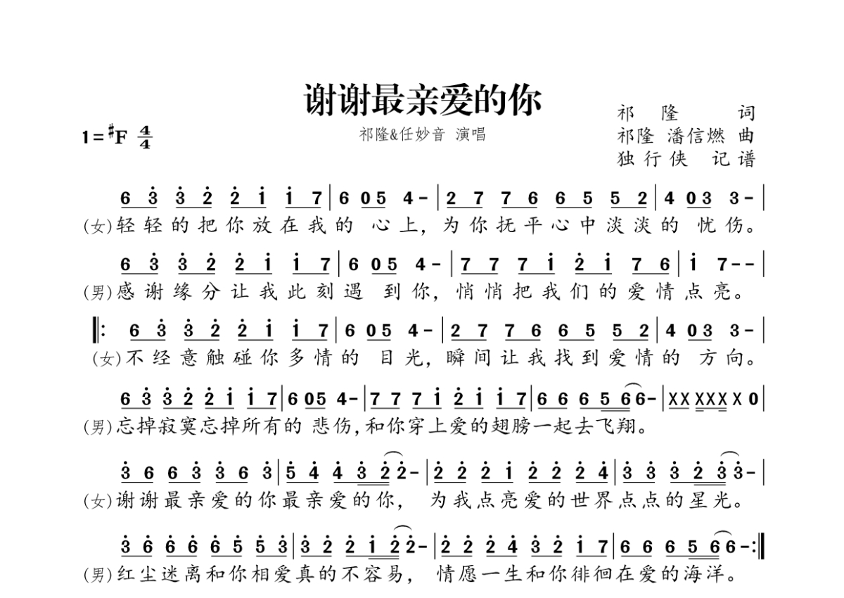 《谢谢最亲爱的你》是祁隆&任妙音演唱的一首歌曲,拍号为4/4拍,这份简谱共有一张高清图谱,图谱由 @独行侠 编配上传。