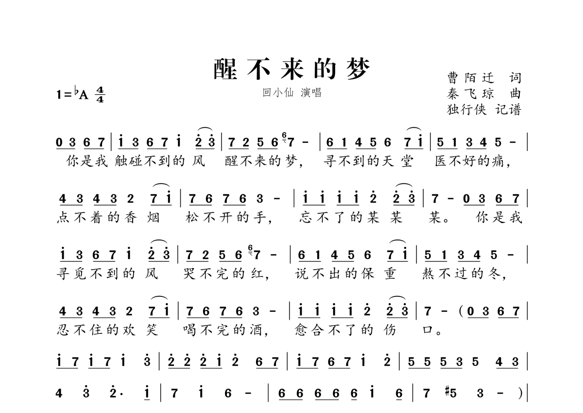 《醒不来的梦》是回小仙演唱的一首歌曲,拍号为4/4拍,这份简谱共有两张高清图谱,图谱由 @独行侠 编配上传。