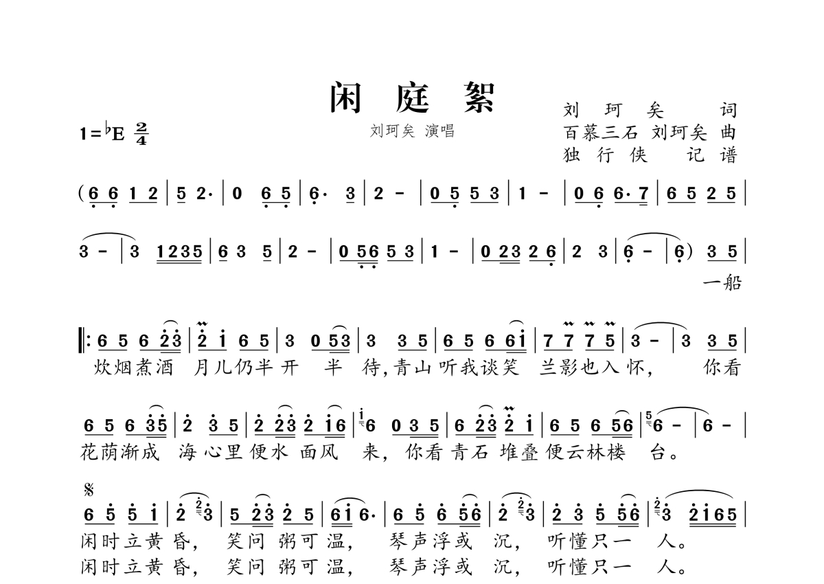 《闲庭絮》是刘珂矣演唱的一首歌曲,拍号为2/4拍,这份简谱共有一张高清图谱,图谱由 @独行侠 编配上传。