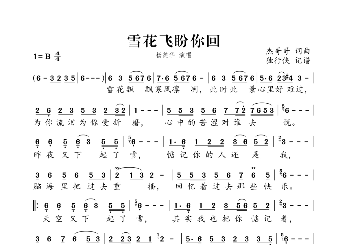 《雪花飞盼你回》是杨美华演唱的一首歌曲,拍号为4/4拍,这份简谱共有一张高清图谱,图谱由 @独行侠 编配上传。