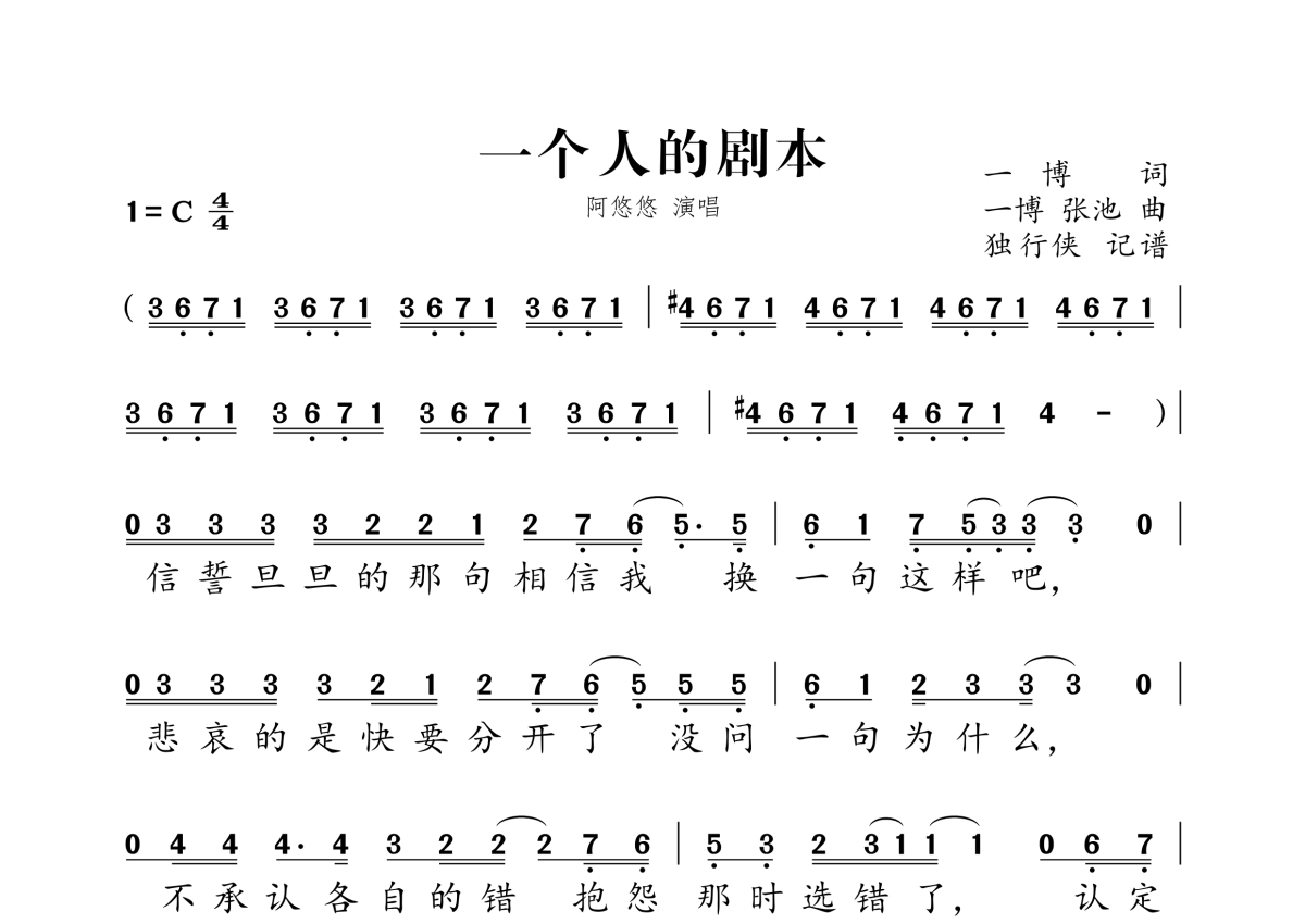 《一个人的剧本》是阿悠悠演唱的一首歌曲,拍号为4/4拍,这份简谱共有两张高清图谱,图谱由 @独行侠 编配上传。