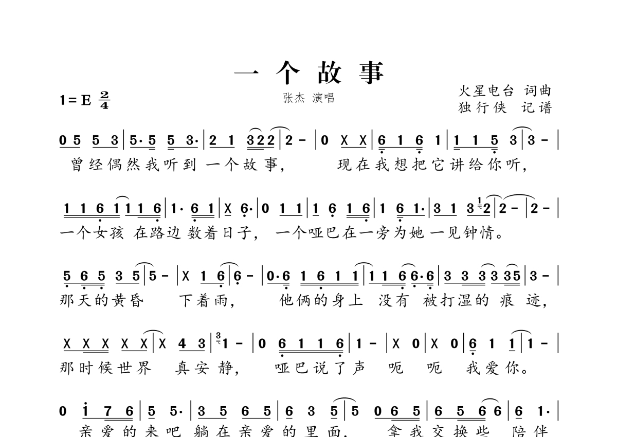 《一个故事》是张杰演唱的一首歌曲,拍号为2/4拍,这份简谱共有两张高清图谱,图谱由 @独行侠 编配上传。