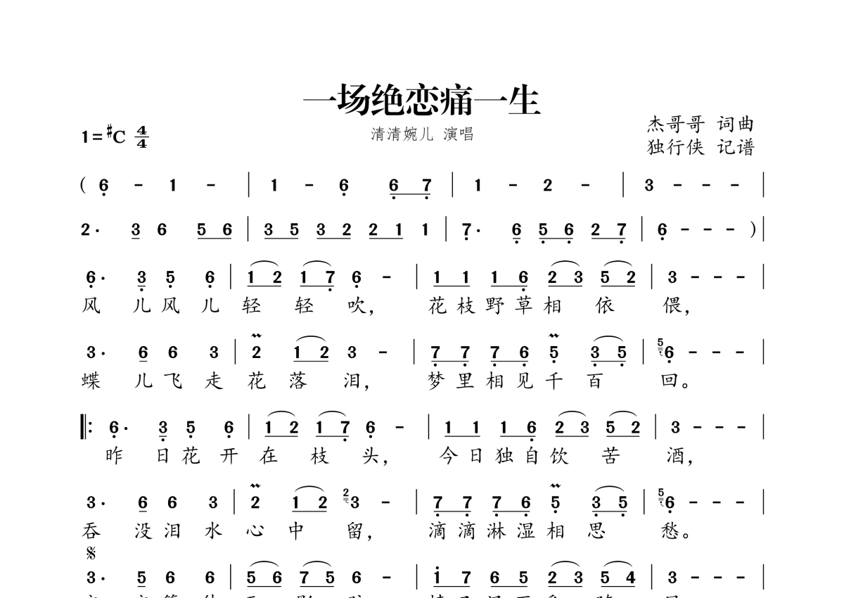 《一场绝恋痛一生(独唱)-清清婉儿》是清清婉儿演唱的一首歌曲,拍号为4/4拍,这份简谱共有一张高清图谱,图谱由 @独行侠 编配上传。
