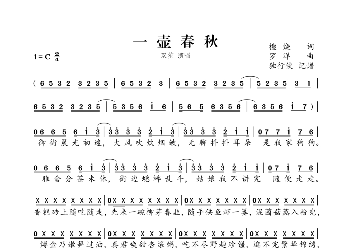 《一壶春秋》是双笙 (陈元汐)演唱的一首歌曲,拍号为2/4拍,这份简谱共有两张高清图谱,图谱由 @独行侠 编配上传。