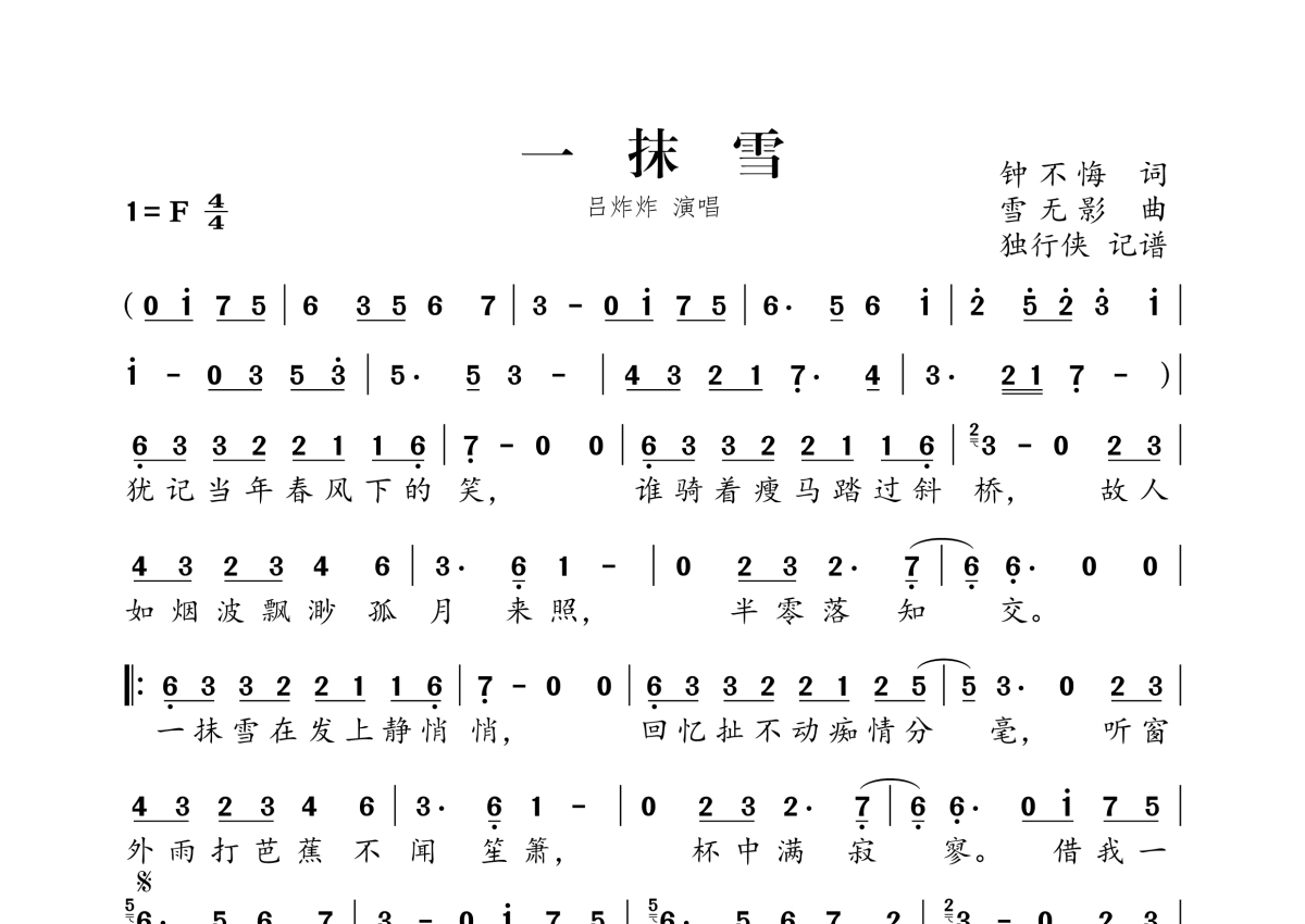 《一抹雪》是吕炸炸演唱的一首歌曲,拍号为4/4拍,这份简谱共有一张高清图谱,图谱由 @独行侠 编配上传。