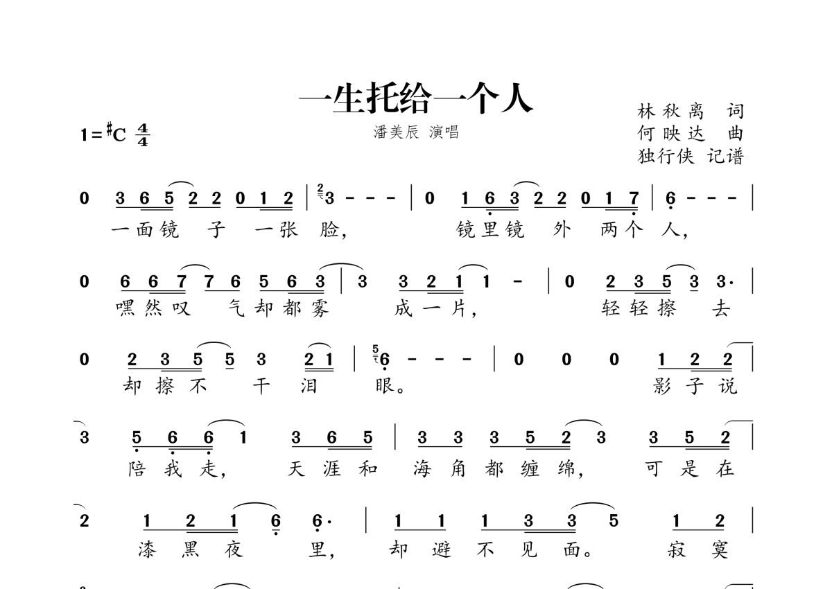 《一生托给一个人》是潘美辰演唱的一首歌曲,拍号为4/4拍,这份简谱共有一张高清图谱,图谱由 @独行侠 编配上传。