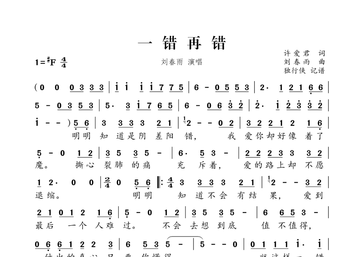 《一错再错》是刘春雨演唱的一首歌曲,拍号为4/4拍,这份简谱共有一张高清图谱,图谱由 @独行侠 编配上传。