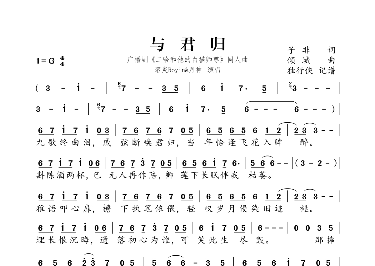 《与君归》是落炎Royin&月神演唱的一首歌曲,拍号为4/4拍,这份简谱共有两张高清图谱,图谱由 @独行侠 编配上传。