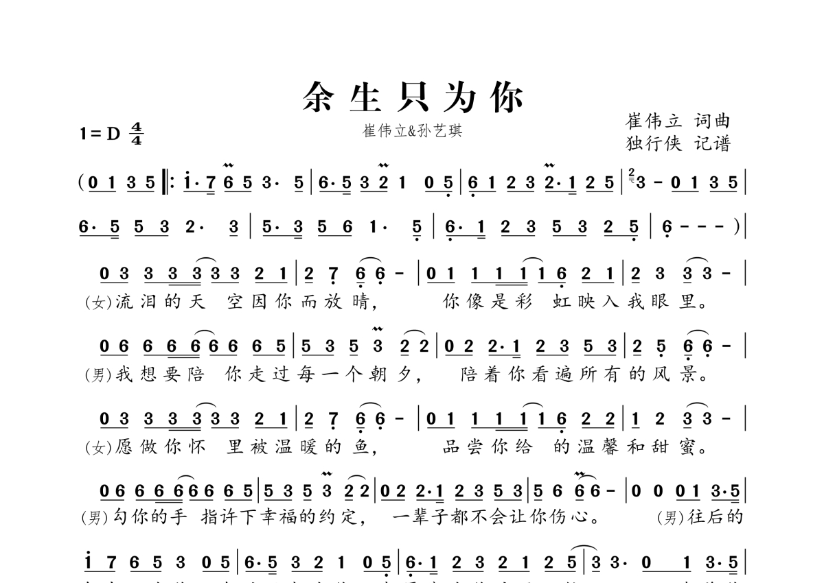 崔伟立&孙艺琪《余生只为你》简谱
