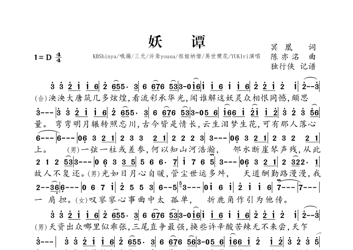 妖谭简谱 - KBShinya&哦漏&三无&泠鸢yousa&祖娅纳惜&易世樊花&yukiri演唱