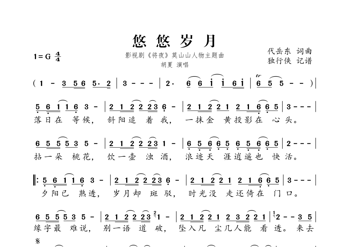 《悠悠岁月》是胡夏演唱的一首歌曲,拍号为4/4拍,这份简谱共有一张高清图谱,图谱由 @独行侠 编配上传。