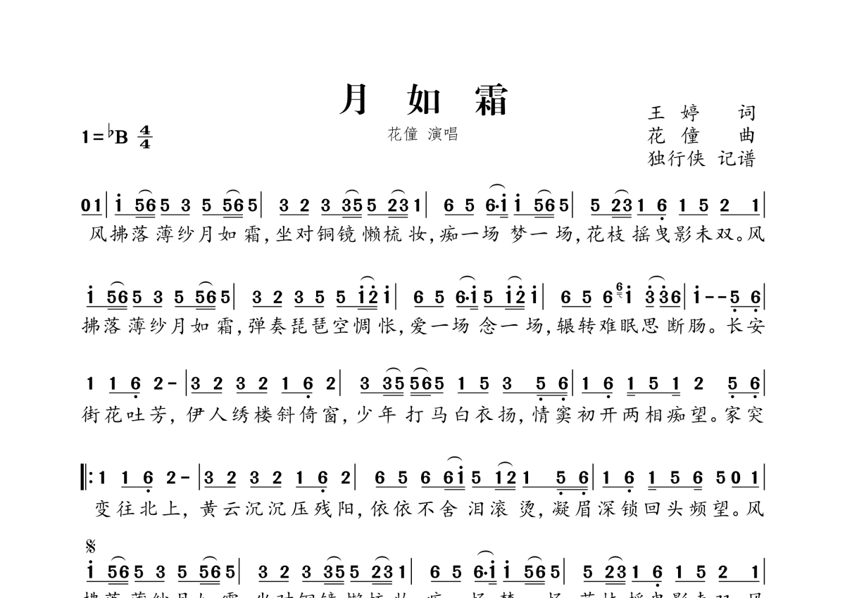《月如霜》是花僮演唱的一首歌曲,拍号为4/4拍,这份简谱共有一张高清图谱,图谱由 @独行侠 编配上传。