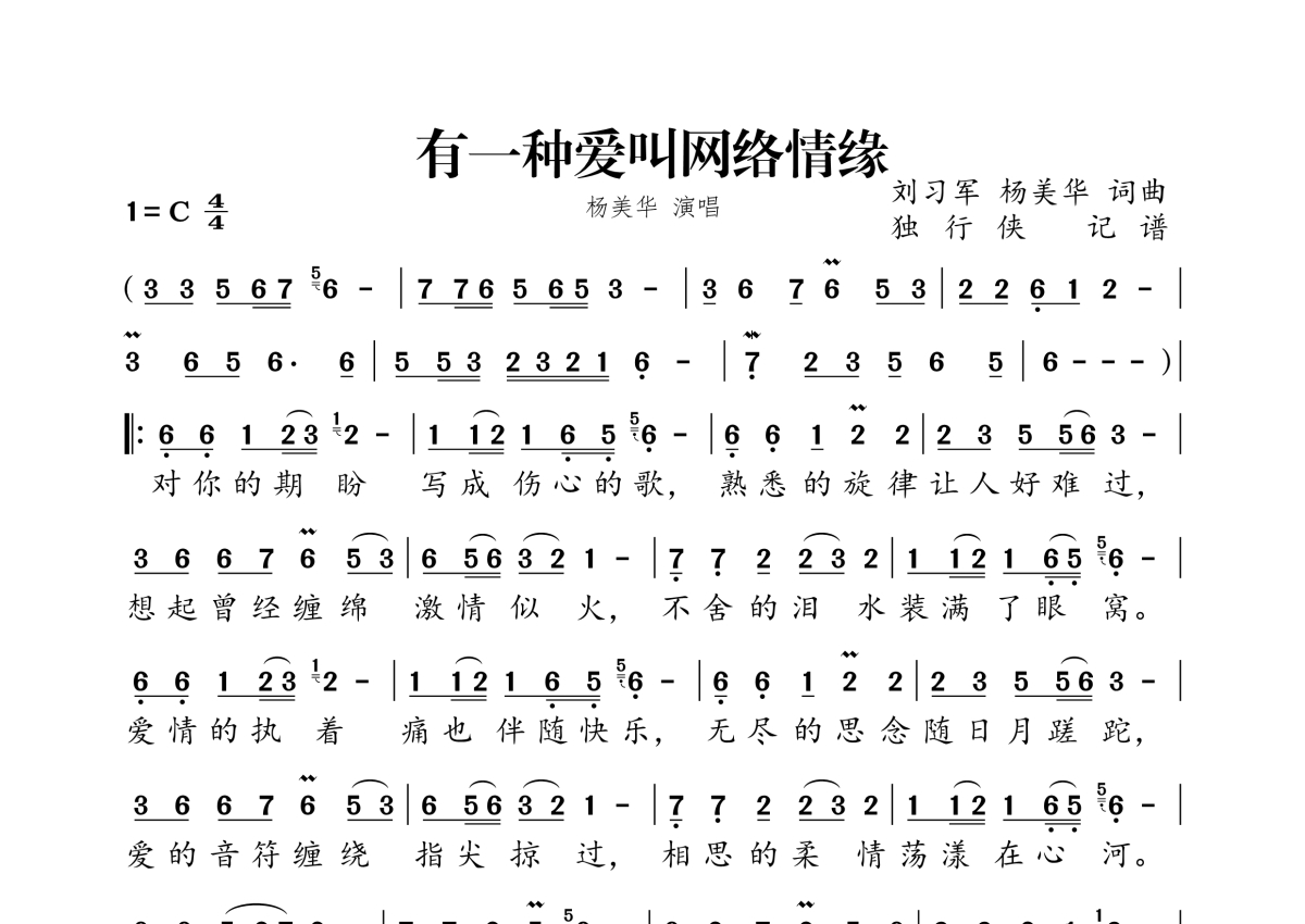 《有一种爱叫网络情缘》是杨美华演唱的一首歌曲,拍号为4/4拍,这份简谱共有一张高清图谱,图谱由 @独行侠 编配上传。