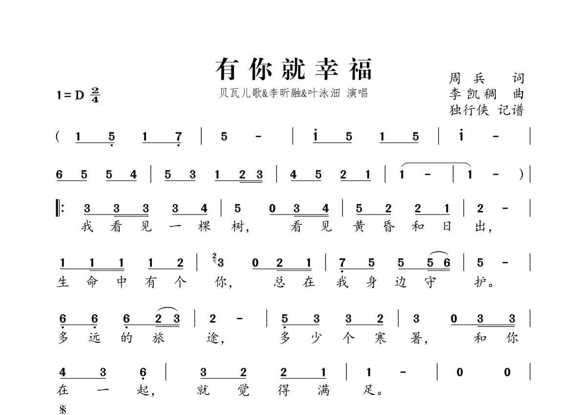 《有你就幸福》是李昕融&叶泳沺演唱的一首歌曲,拍号为2/4拍,这份简谱共有一张高清图谱,图谱由 @独行侠 编配上传贝瓦儿歌。