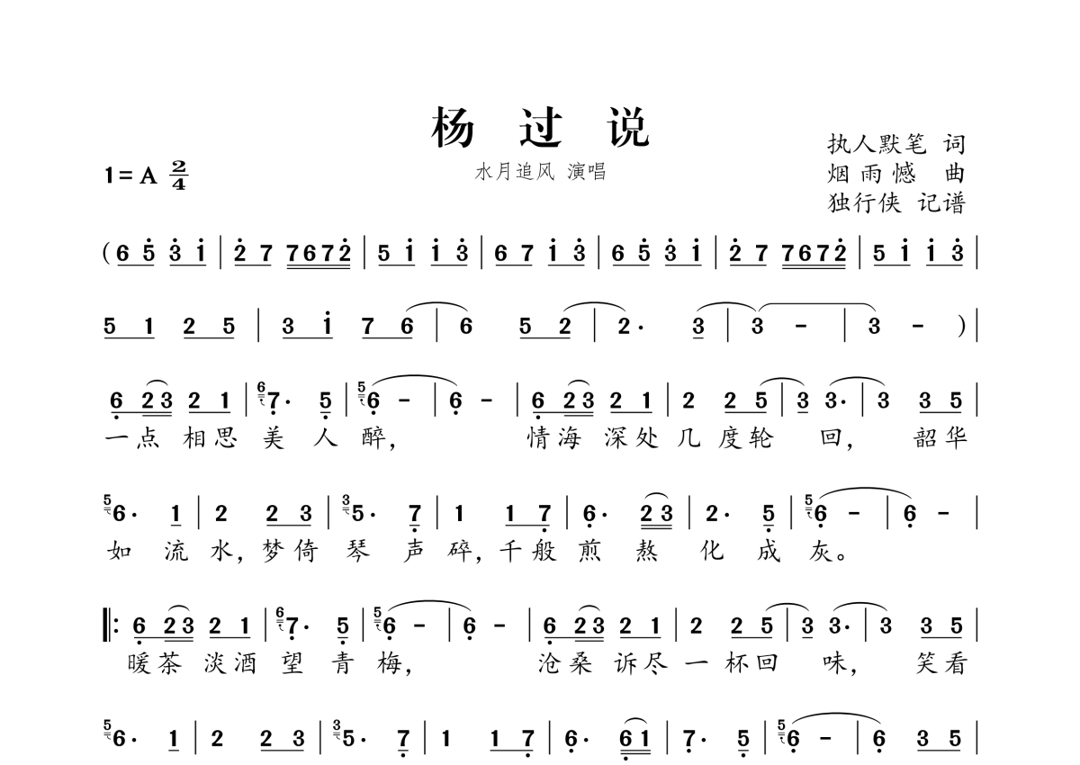 《杨过说》是水月追风演唱的一首歌曲,拍号为2/4拍,这份简谱共有一张高清图谱,图谱由 @独行侠 编配上传。