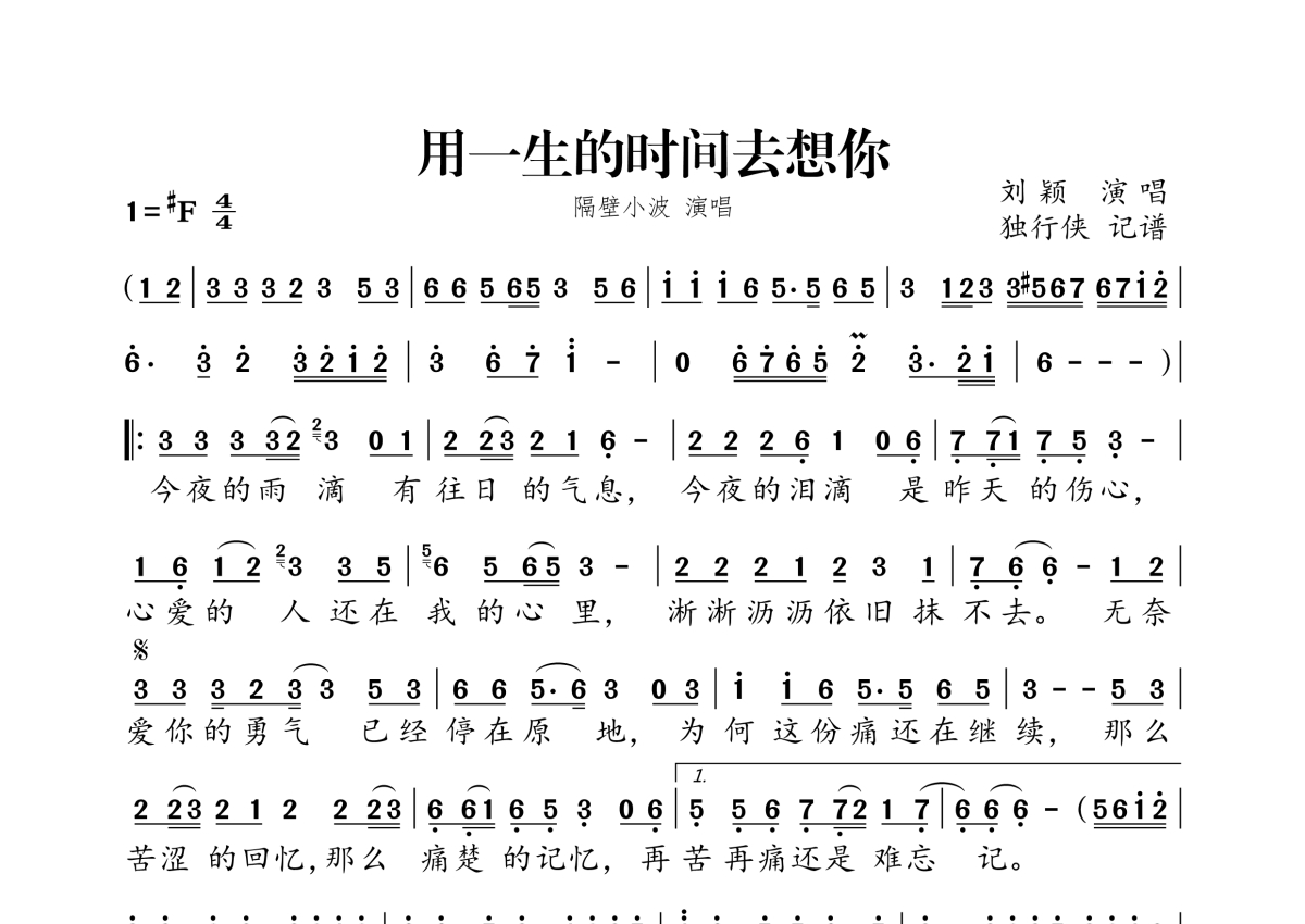 《用一生的时间去想你》是隔壁小波演唱的一首歌曲,拍号为4/4拍,这份简谱共有一张高清图谱,图谱由 @独行侠 编配上传。