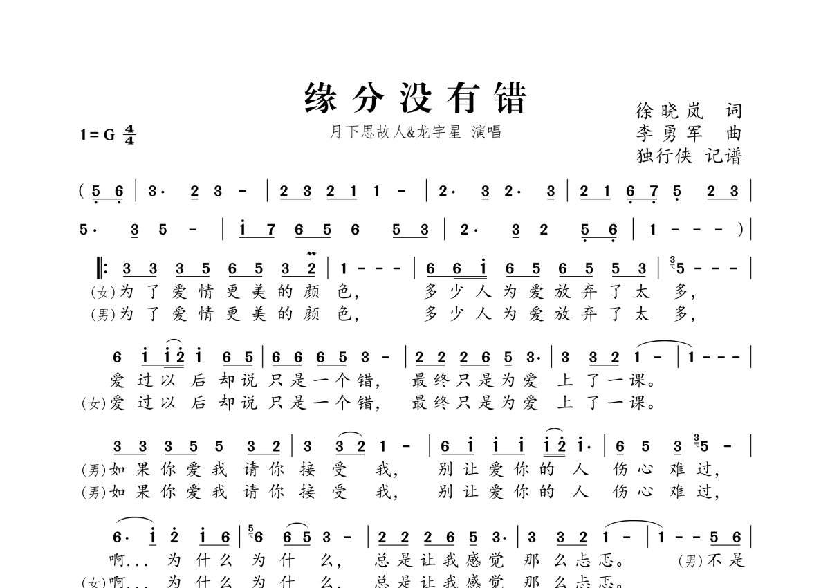 《缘分没有错》是月下思故人&龙宇星演唱的一首歌曲,拍号为4/4拍,这份简谱共有一张高清图谱,图谱由 @独行侠 编配上传。