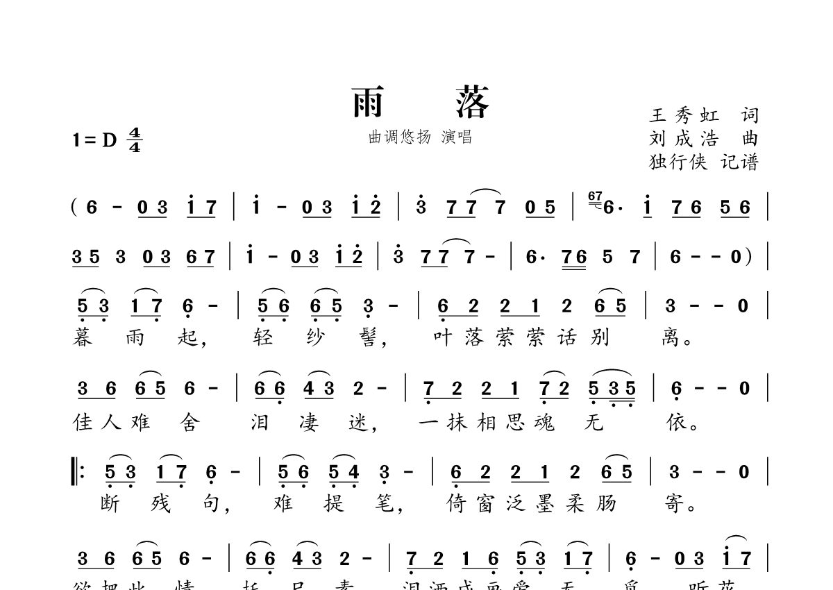 雨落简谱 - 曲调悠扬演唱