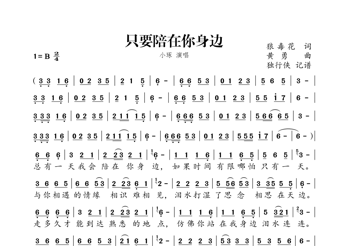 《只要陪在你身边》是小琢演唱的一首歌曲,拍号为2/4拍,这份简谱共有一张高清图谱,图谱由 @独行侠 编配上传。