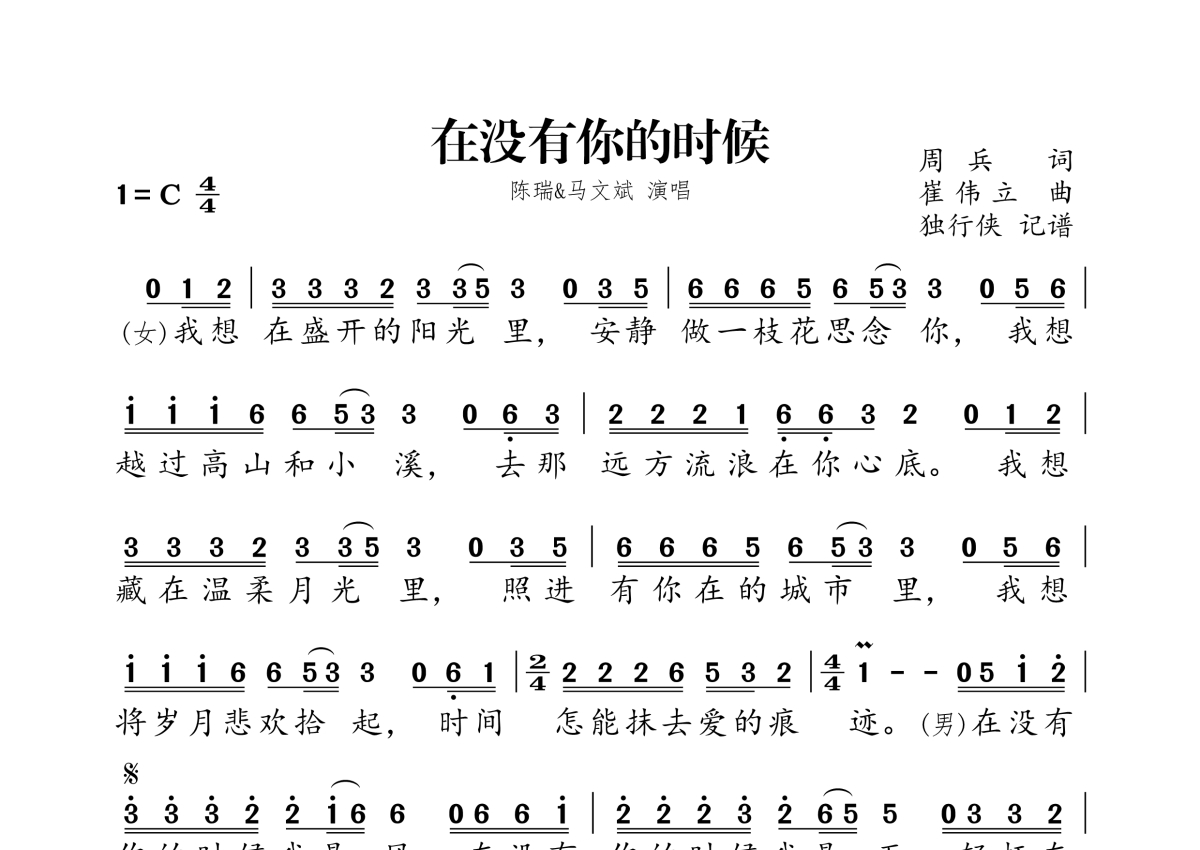 《在没有你的时候》是陈瑞&马庆斌演唱的一首歌曲,拍号为4/4拍,这份简谱共有一张高清图谱,图谱由 @独行侠 编配上传。