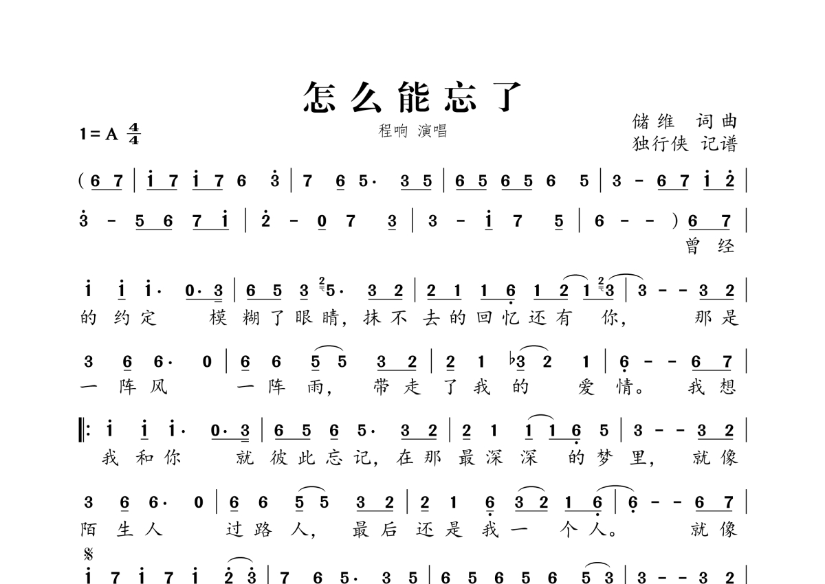 《怎么能忘了》是程响演唱的一首歌曲,拍号为4/4拍,这份简谱共有一张高清图谱,图谱由 @独行侠 编配上传。