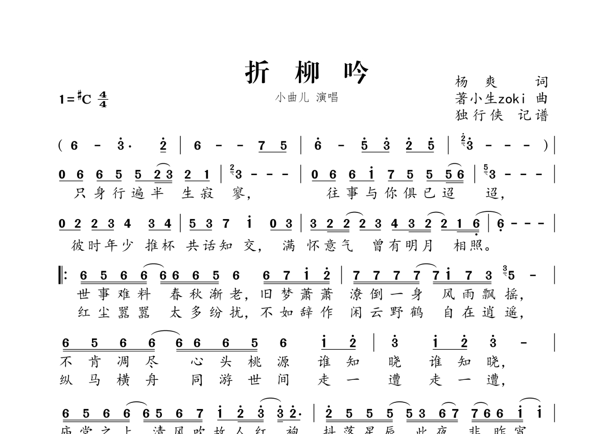 《折柳吟》是小曲儿演唱的一首歌曲,拍号为4/4拍,这份简谱共有一张高清图谱,图谱由 @独行侠 编配上传。
