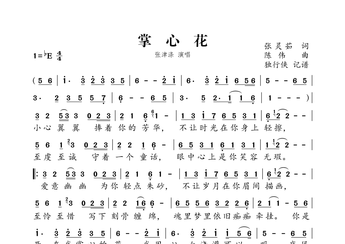 《掌心花》是张津涤演唱的一首歌曲,拍号为4/4拍,这份简谱共有一张高清图谱,图谱由 @独行侠 编配上传。