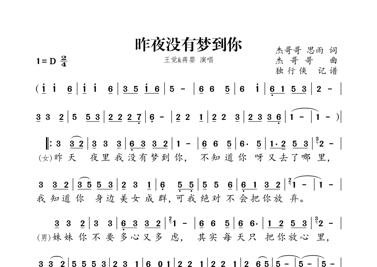 《昨夜没有梦到你》是王觉&蒋婴演唱的一首歌曲,拍号为2/4拍,这份简谱共有两张高清图谱,图谱由 @独行侠 编配上传。
