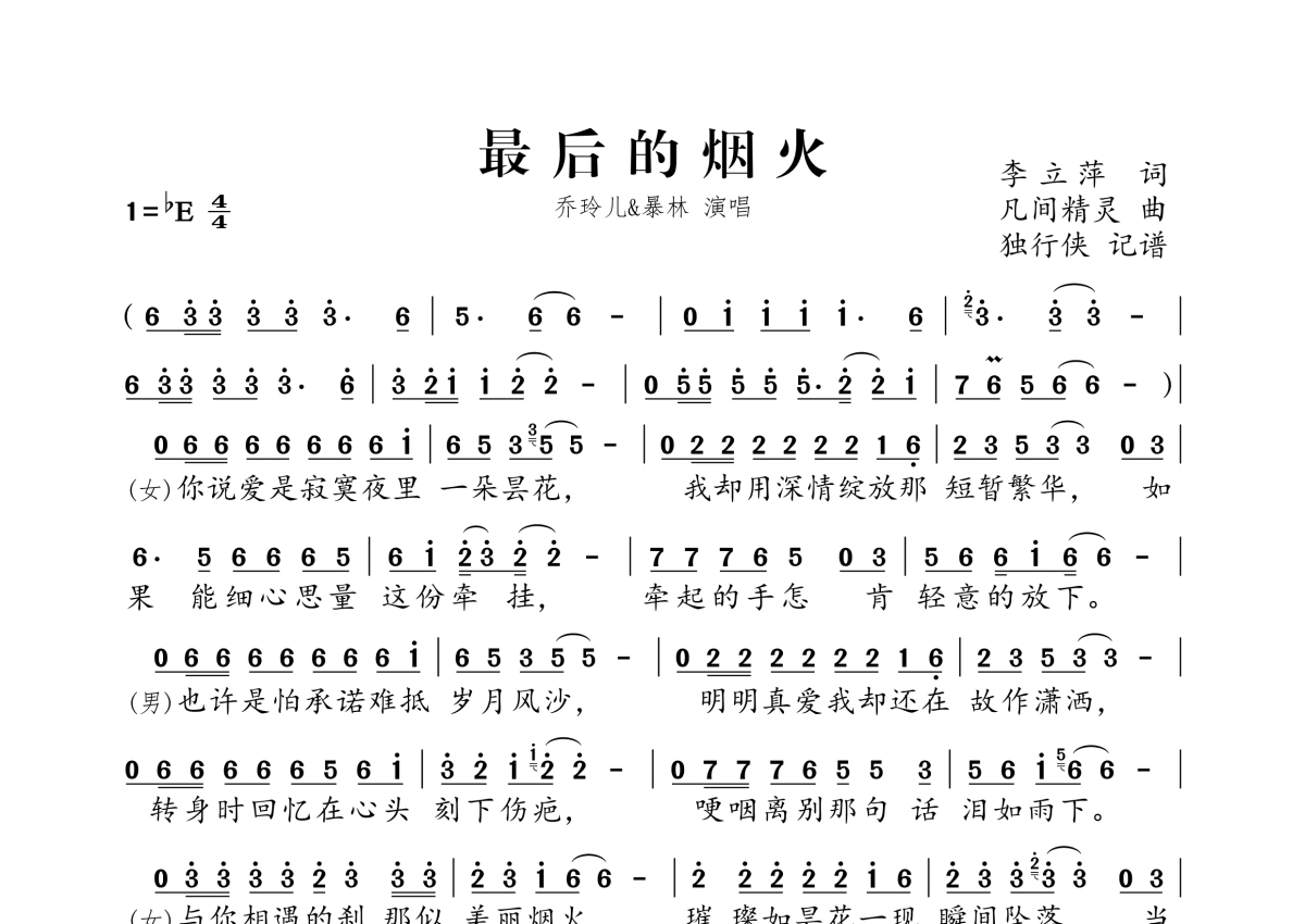《最后的烟火》是暴林&乔玲儿演唱的一首歌曲,拍号为4/4拍,这份简谱共有一张高清图谱,图谱由 @独行侠 编配上传。