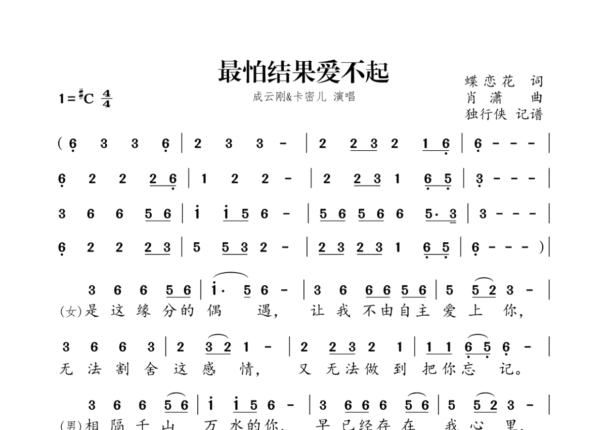 《最怕结果爱不起》是成云刚&卡密儿演唱的一首歌曲,拍号为4/4拍,这份简谱共有两张高清图谱,图谱由 @独行侠 编配上传。
