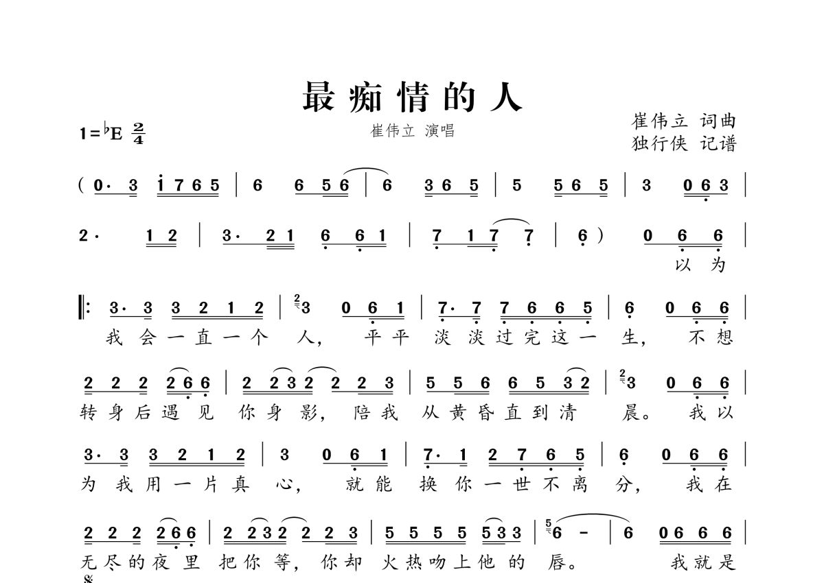 《最痴情的人》是崔伟立演唱的一首歌曲,拍号为2/4拍,这份简谱共有一张高清图谱,图谱由 @独行侠 编配上传。
