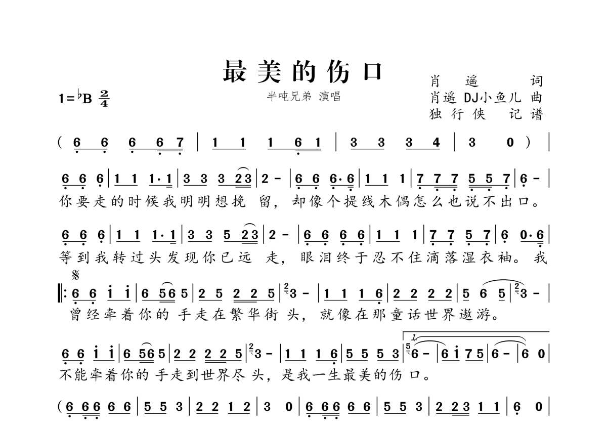 《最美的伤口》是半吨兄弟演唱的一首歌曲,拍号为2/4拍,这份简谱共有一张高清图谱,图谱由 @独行侠 编配上传。