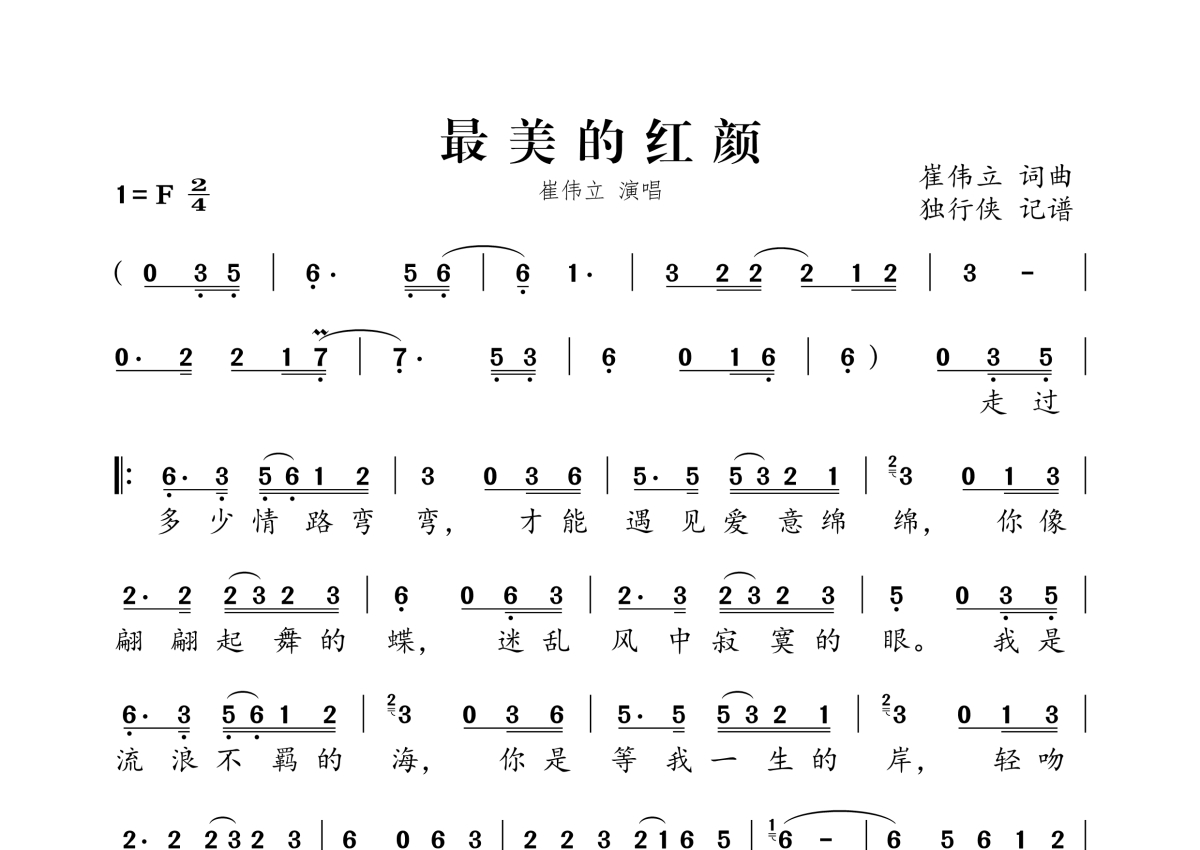 《最美的红颜》是崔伟立演唱的一首歌曲,拍号为2/4拍,这份简谱共有一张高清图谱,图谱由 @独行侠 编配上传。