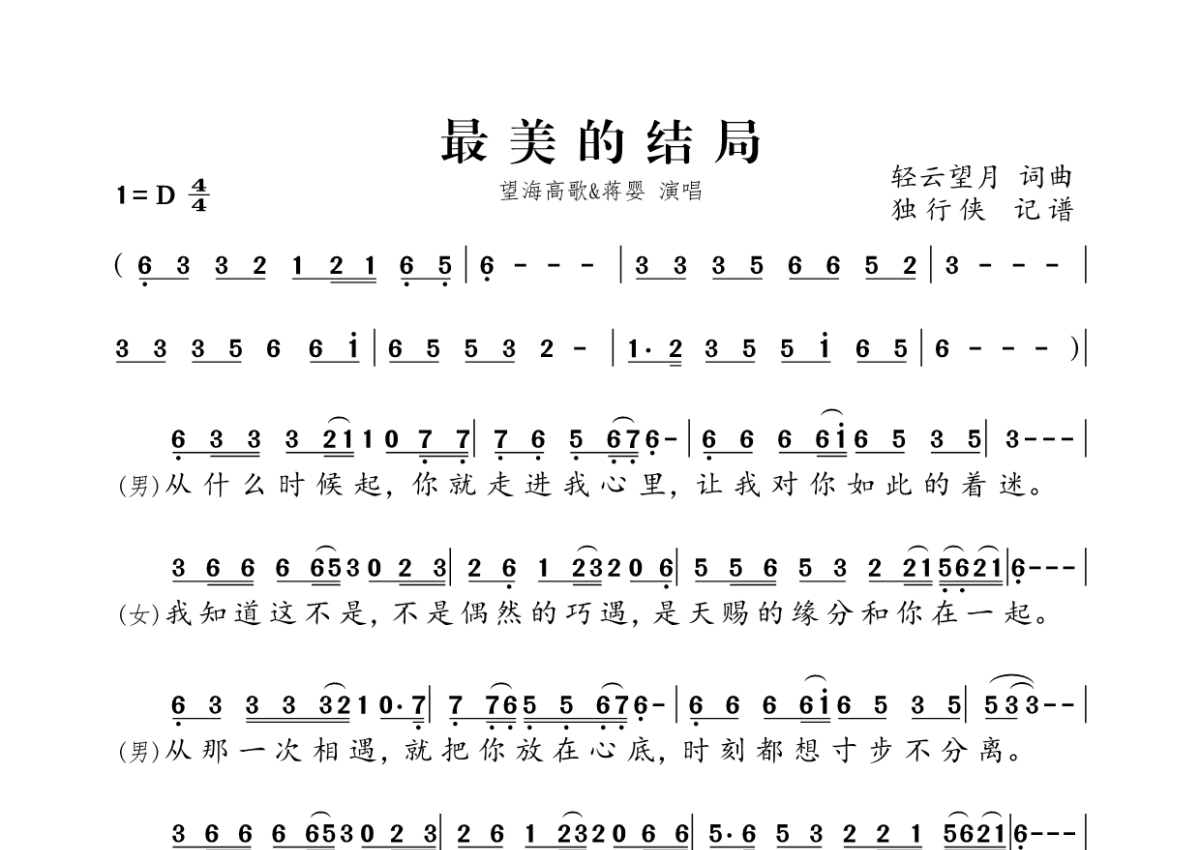 《最美的结局》是望海高歌&蒋婴演唱的一首歌曲,拍号为4/4拍,这份简谱共有一张高清图谱,图谱由 @独行侠 编配上传。