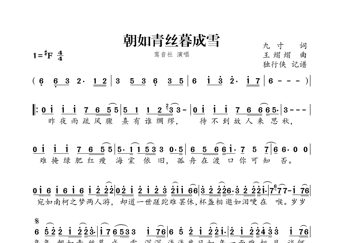 《朝如青丝暮成雪》是鸾音社演唱的一首歌曲,拍号为4/4拍,这份简谱共有一张高清图谱,图谱由 @独行侠 编配上传。