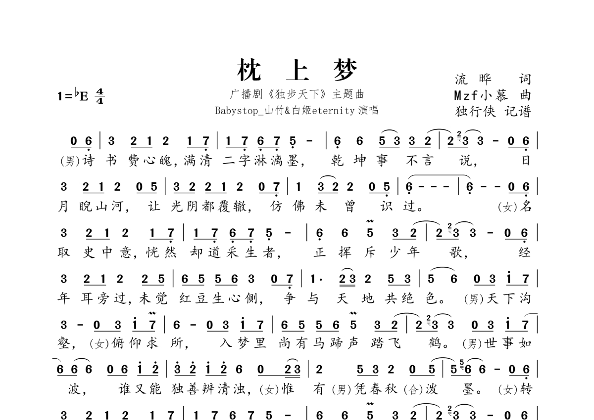 《枕上梦》是Babystop_山竹&白姬eternity演唱的一首歌曲,拍号为4/4拍,这份简谱共有一张高清图谱,图谱由 @独行侠 编配上传。