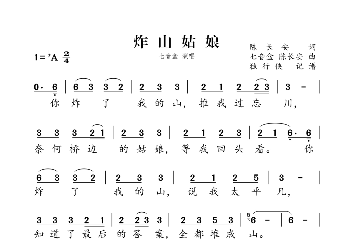 《炸山姑娘2》是七音盒演唱的一首歌曲,拍号为2/4拍,这份简谱共有两张高清图谱,图谱由 @独行侠 编配上传。
