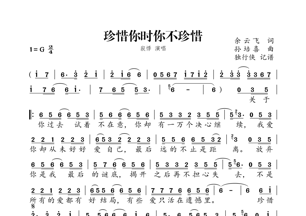 《珍惜你时你不珍惜》是寂悸演唱的一首歌曲,拍号为2/4拍,这份简谱共有一张高清图谱,图谱由 @独行侠 编配上传。