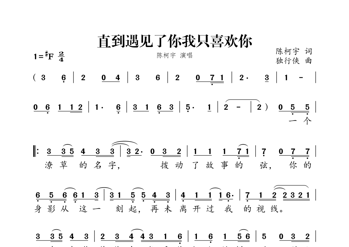 《直到遇见了你我只喜欢你》是陈柯宇演唱的一首歌曲,拍号为2/4拍,这份简谱共有两张高清图谱,图谱由 @独行侠 编配上传。