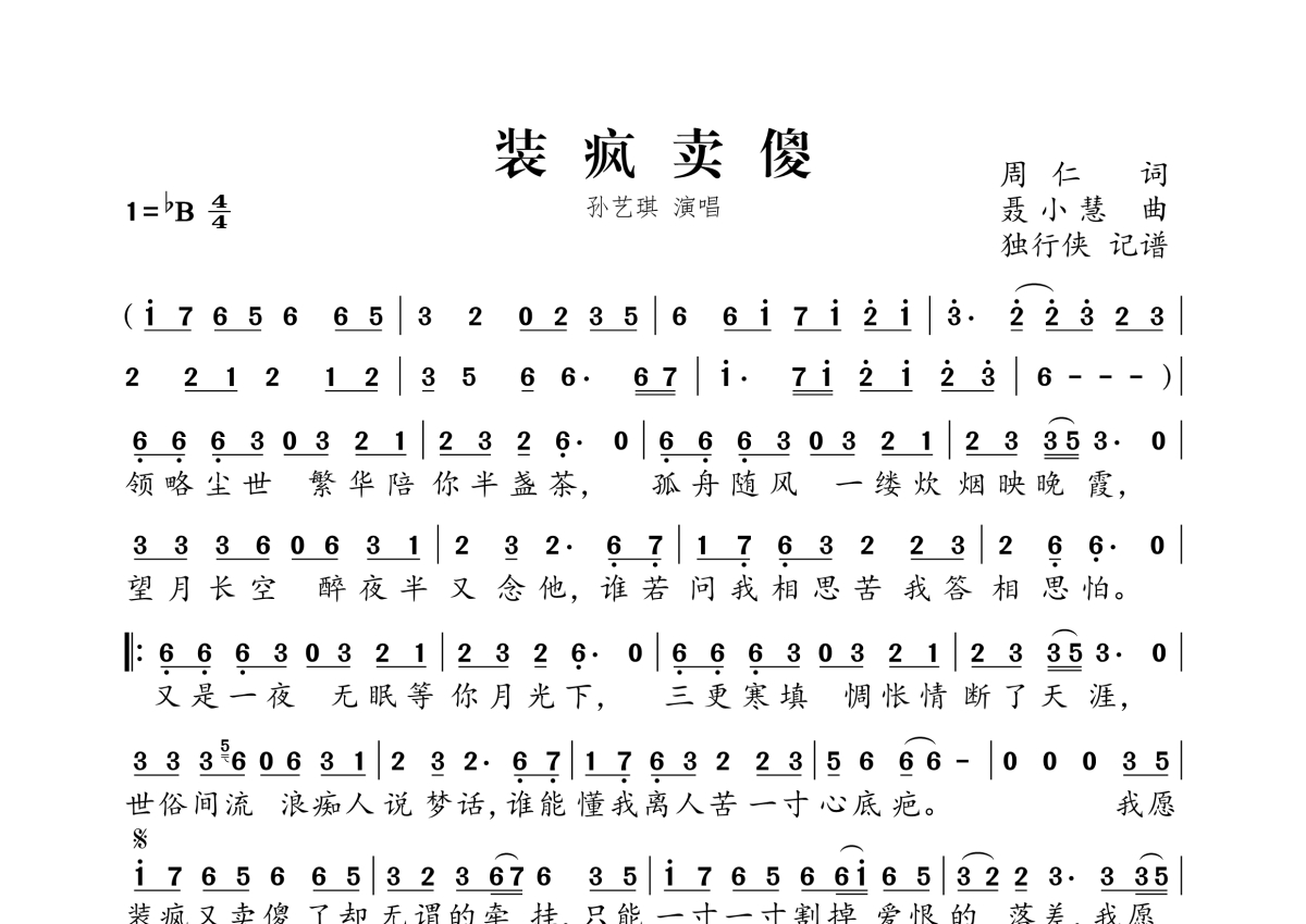 《装疯卖傻》是孙艺琪演唱的一首歌曲,拍号为4/4拍,这份简谱共有一张高清图谱,图谱由 @独行侠 编配上传。