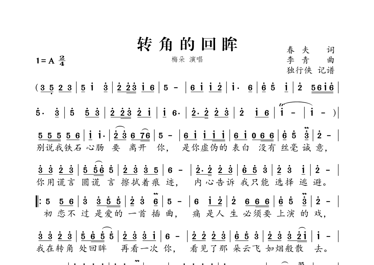 《转角的回眸》是梅朵演唱的一首歌曲,拍号为2/4拍,这份简谱共有一张高清图谱,图谱由 @独行侠 编配上传。