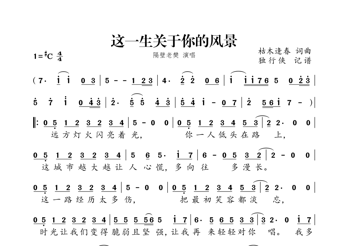 《这一生关于你的风景》是隔壁老樊演唱的一首歌曲,拍号为4/4拍,这份简谱共有一张高清图谱,图谱由 @独行侠 编配上传。