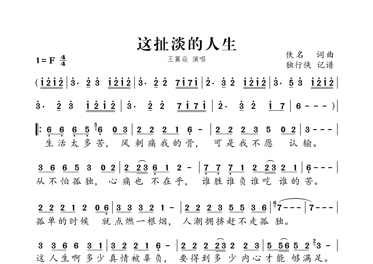 《这扯淡的人生》是王翼焱演唱的一首歌曲,拍号为4/4拍,这份简谱共有一张高清图谱,图谱由 @独行侠 编配上传。